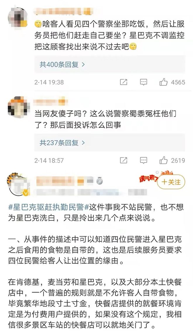 2月13日,有網(wǎng)友發(fā)帖稱:重慶一星巴克趕走在門口吃盒飯的四位民警,認(rèn)為民警“會影響品牌形象”,事后還惡意投訴。