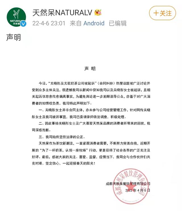 隨即,成都天然呆餐飲管理有限公司于昨夜23:01發(fā)布聲明,企圖撇清關(guān)曉彤與天然呆的關(guān)系。