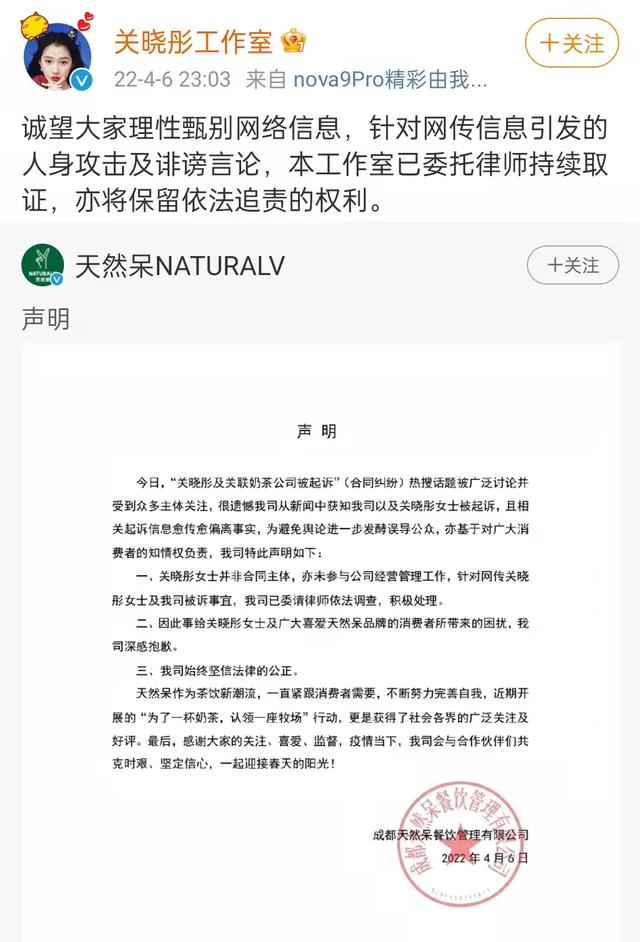關(guān)曉彤工作室也于昨夜23:03轉(zhuǎn)發(fā)了這一聲明,并表示將保留追究造謠者法律責(zé)任的權(quán)利。