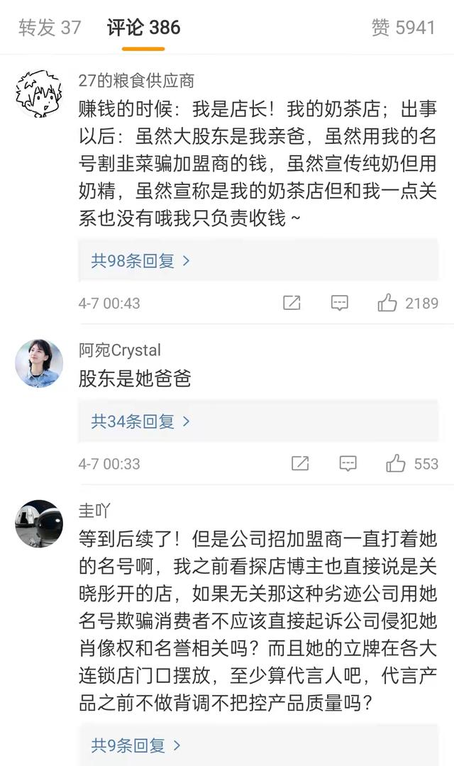 從網(wǎng)友所爆出的截圖來(lái)看,關(guān)曉彤作為“天然呆”的代言人,不僅通過(guò)多種渠道為奶茶店宣傳,還擔(dān)任了其名譽(yù)店長(zhǎng),天然呆奶茶店日夜播放關(guān)曉彤的MV,關(guān)曉彤的父親更是間接持有“天然呆”35%的股份。