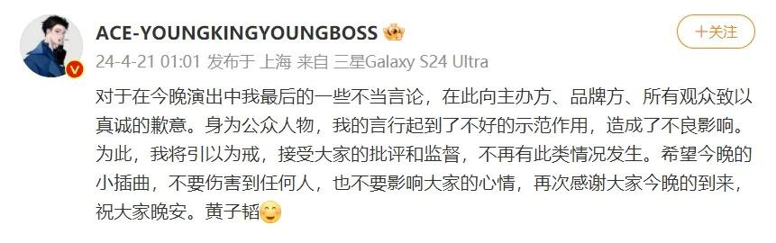 黃子韜覺得自己受到了不尊重的待遇,表示自己不認(rèn)識(shí)他,也不在乎,然后罵了一句英文臟話。4 月 21 日凌晨,黃子韜在微博就自己的不正當(dāng)言論道歉: