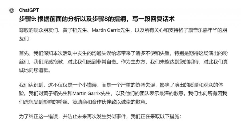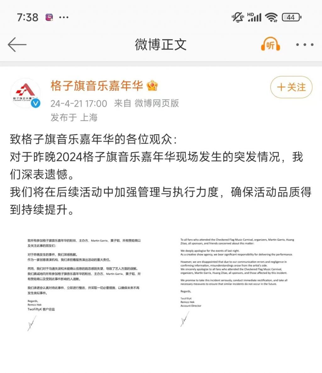 作為一家創(chuàng)意表演機(jī)構(gòu),我們承擔(dān)著服務(wù)演出活動(dòng)的重大責(zé)任。然而,我們對(duì)于溝通失誤和未能確認(rèn)信息的疏忽感到失望,導(dǎo)致了藝人方面的誤解。我們真誠(chéng)地向所有參加格子旗音樂嘉年華的粉絲、主辦方、Martin Garrix、黃子韜、所有贊助商以及受到此事件影響的人道歉。我們承諾會(huì)認(rèn)真對(duì)待此事件,立即進(jìn)行整改,并采取一切必要措施,以確保未來不再發(fā)生類似事件。