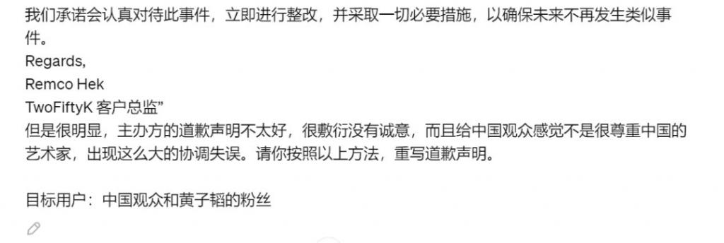作為公眾人物,明星的一舉一動(dòng)都受到大家的關(guān)注;這種情況下,稍微有一點(diǎn)錯(cuò)就會(huì)被放大,甚至需要道歉聲明、開發(fā)布會(huì)才能消弭。在 AI 應(yīng)用如此廣泛的今天,如果用 AI 來做一個(gè)道歉聲明,是不是效率會(huì)更高呢?
