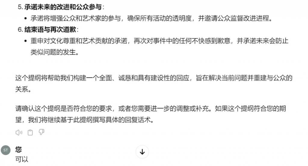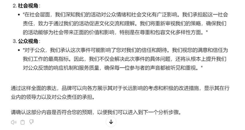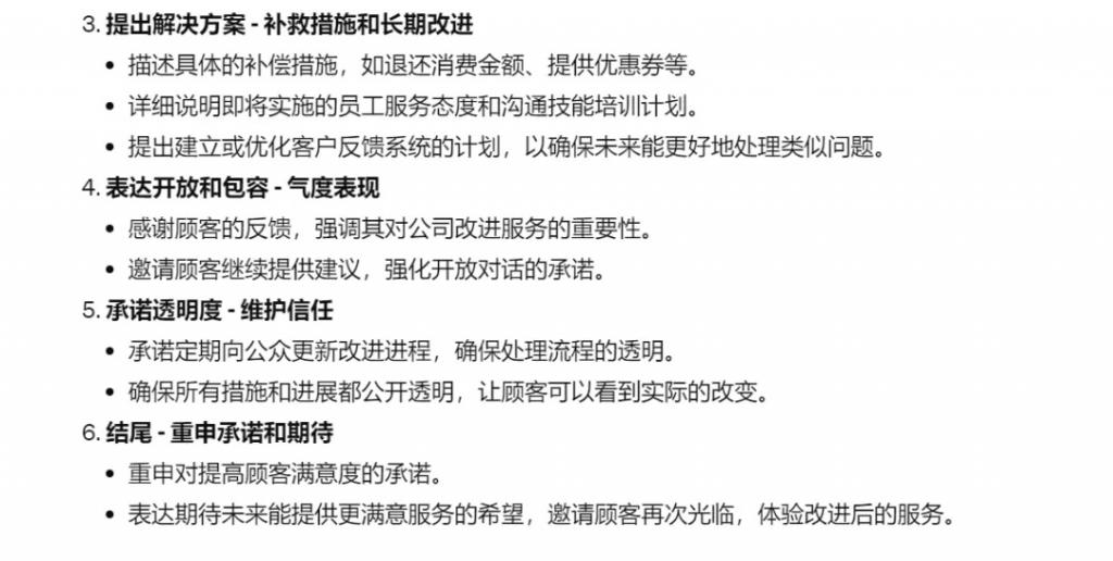 1、能夠在公關(guān)回復(fù)中體現(xiàn)出真誠(chéng)的態(tài)度,確保文本傳達(dá)出對(duì)事件的認(rèn)真反思和對(duì)公眾情緒的敏感回應(yīng)。