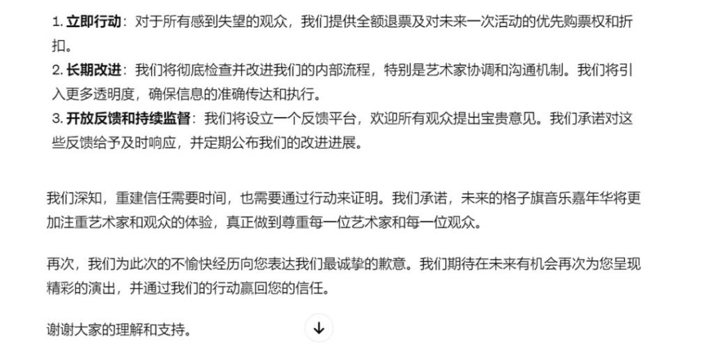 再次,我們?yōu)榇舜蔚牟挥淇旖?jīng)歷向您表達(dá)我們最誠(chéng)摯的歉意。我們期待在未來有機(jī)會(huì)再次為您呈現(xiàn)精彩的演出,并通過我們的行動(dòng)贏回您的信任。謝謝大家的理解和支持。