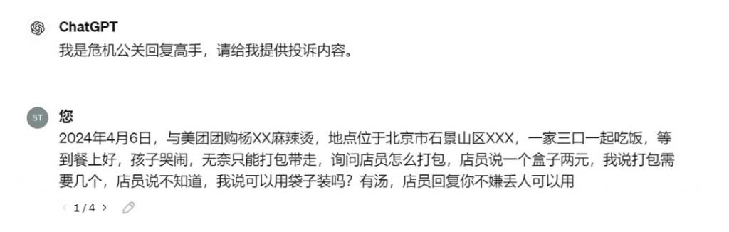 某顧客在黑貓投訴上反饋,2024 年 4 月 6 日,在某團(tuán)團(tuán)購(gòu)楊 XX 麻辣燙,地點(diǎn)位于北京市石景山區(qū),一家三口一起吃飯。等餐上好后,孩子哭鬧,無奈只能打包帶走。詢問店員怎么打包,店員說一個(gè)盒子兩元。我說打包需要幾個(gè)?店員說不知道,我說可以用袋子裝嗎?有湯。店員回復(fù),你不嫌丟人可以用。
