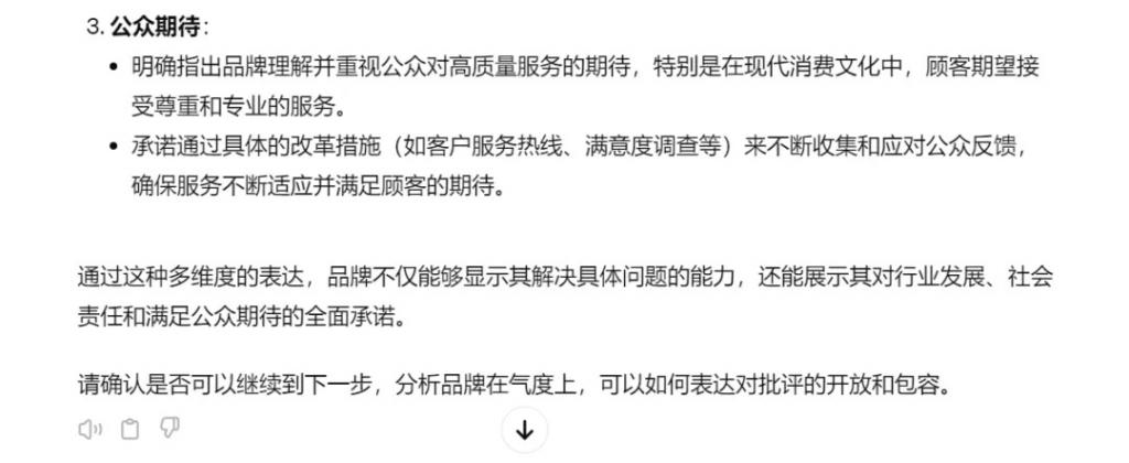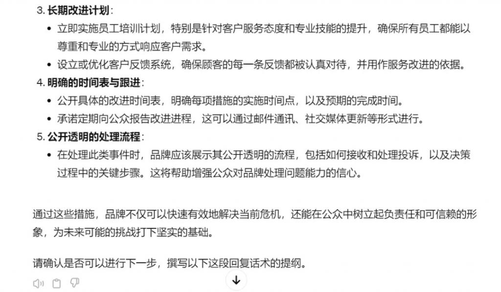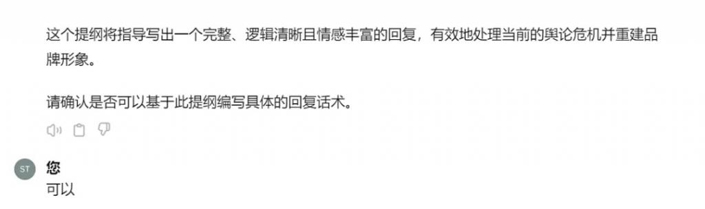 2、具備快速生成回復(fù)內(nèi)容的能力,確保在短時(shí)間內(nèi)回應(yīng)公眾關(guān)切,表現(xiàn)出企業(yè)的責(zé)任感和緊急行動(dòng)力。