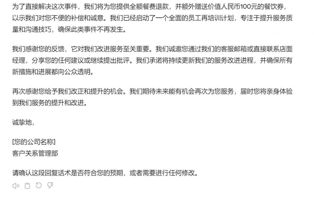 確實(shí),我們的員工在處理您的合理需求時(shí)展現(xiàn)出的態(tài)度和回答方式,不僅不適當(dāng),而且?guī)в形耆栊?,這是我們所不能接受的。為了直接解決這次事件,我們將為您提供全額餐費(fèi)退款,并額外贈(zèng)送價(jià)值人民幣 100 元的餐飲券,以示我們對(duì)您不便的補(bǔ)償和誠(chéng)意。