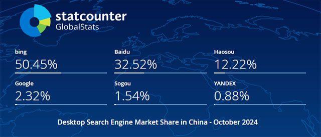 Bing:50.45%,Baidu:32.52%,Haoso:12.22%,Google:2.32%,Sogou:1.54%,YANDEX:0.88%