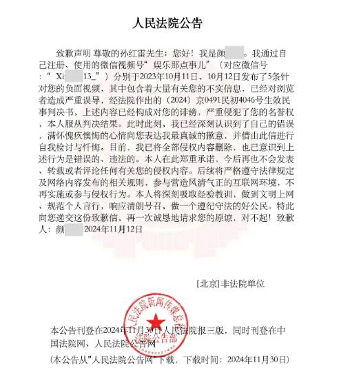法院最后判決,顏某得在微信視頻號上公開向孫紅雷道歉,還得賠償孫紅雷精神損失費和維權的費用,一共5萬元人民幣。顏某已經賠了錢,還在媒體上公開向孫紅雷道了歉。