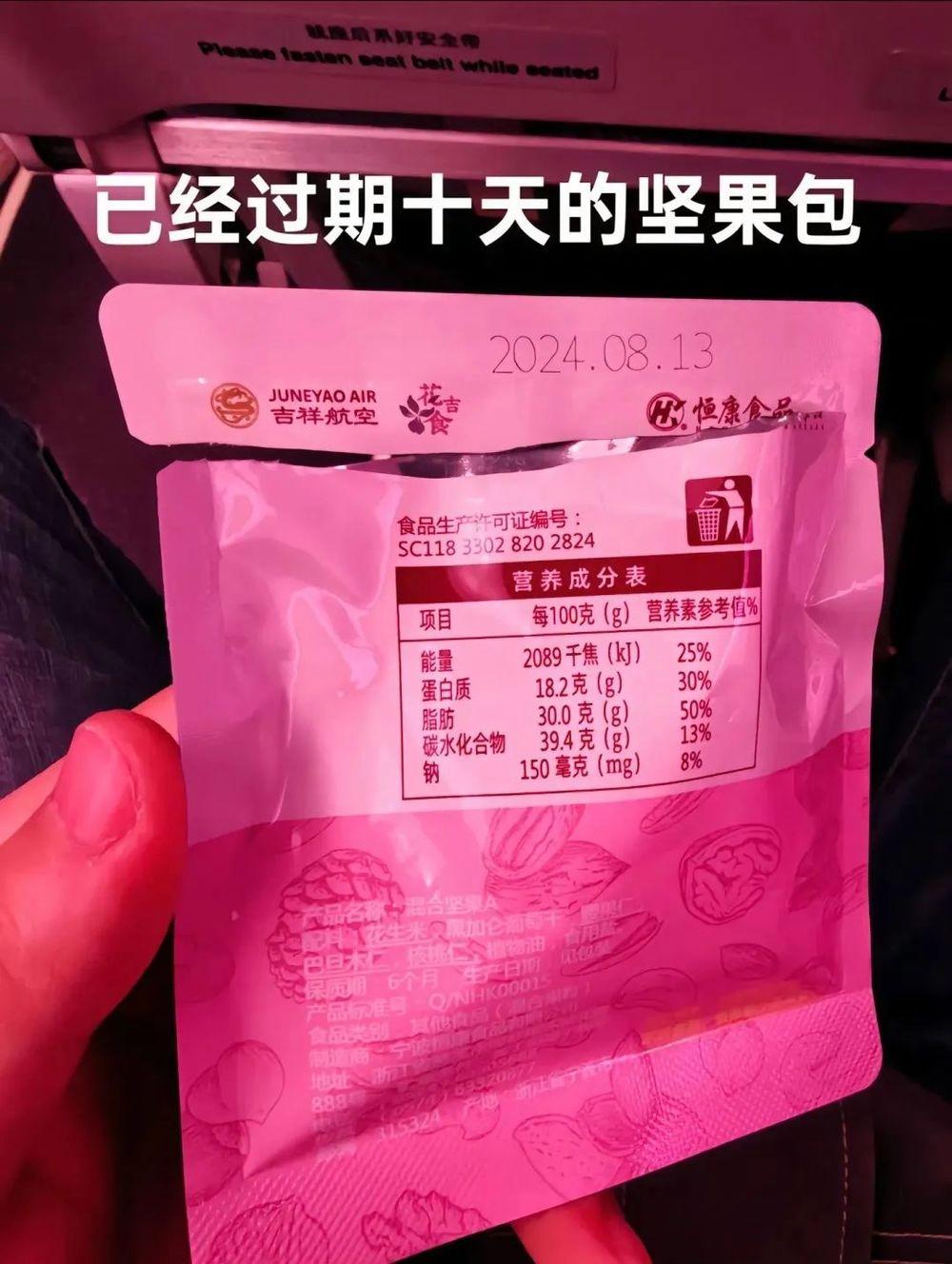據乘客提供的信息,堅果零食包裝上標注的生產日期為2024年8月13日,保質期為6個月。然而,在航班上發放時,該零食包已經超過保質期10天。